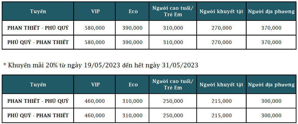 Đối với vé trẻ em (6-11 tuổi)và người cao tuổi: 250.000 đồng/vé/chiều